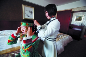 昨日,蒙古族女孩韓笑幫鄂溫克族女孩蘇玉秀綁頭飾。她們將和另外110名各族青少年一起參加國慶慶典。本報記者 孫純霞 攝