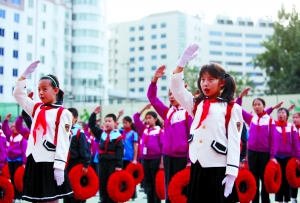 國慶慶典背景表演中,位于中心區的翻花表演,以及廣場最前端的七色光表演方陣均以學生為主。昨日,記者走訪了部分參演學校,了解了表演中的一些細節。(記者溫薷)