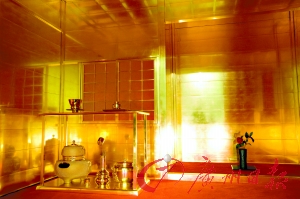 該茶室長2.7米,寬2.55米,高2.5米。由日本長野一家公司以日本戰國時代末期封建領主豐臣秀吉1587年修建的黃金茶室為原型,1比1復制而成。