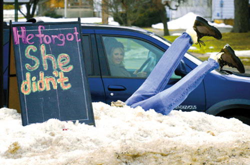 美國俄亥俄州謝爾比,一名開車路過的女子被這一幕逗笑了:情人節(jié)前夕,一家花店外的一堆雪里,一名男模特人造模型的腦袋扎進雪堆里,只露兩條腿,旁邊一塊黑板上用粉筆字寫著“他忘記了(情人節(jié)),但是,她沒有”,幽默地表達一個忘記在情人節(jié)給女友或者愛人買花的男人被扔出去的可憐下場,充滿創(chuàng)意。