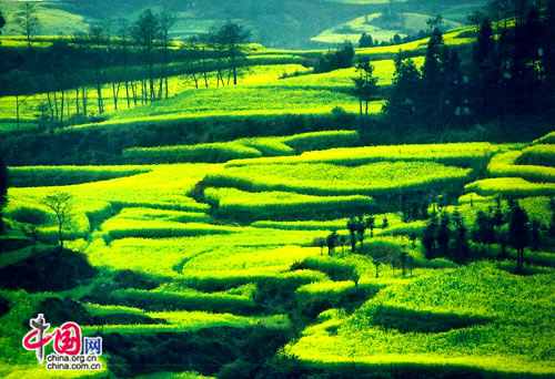金色的山崗、金色的溝壑、金色的原野、金色的河堤、金色的花壇、金色的盆景,金色鋪設了羅平的山山水水,羅平成了金色的世界。