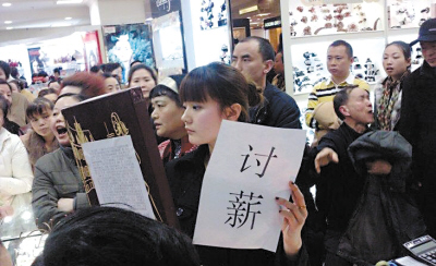 “三八”節(jié)本該是婦女的節(jié)日,然而這一天重慶解放碑鬧市某商場卻出現(xiàn)了一名漂亮女子舉紙條討薪維權(quán)的場面,驚動了110民警。原來,這名討薪女子是廣州一家公司駐該商場的營業(yè)員,因未接待顧客被公司罰款100元,拒交后又遭到調(diào)崗處理。雙方關(guān)系“拉爆”后,遂來到商場追討千余元欠薪。昨天,經(jīng)渝中區(qū)勞動局介入,當(dāng)事雙方已達(dá)成協(xié)議,公司方面支付了她3年多的保險金,欠薪也即將支付。