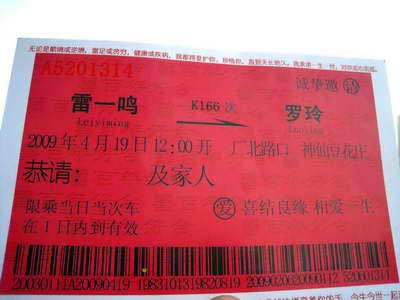 “太牛了,簡直就是個牛人!弊蛉罩形11時多,在婚禮現場,新郎的好友楊先生拿著明信片大小的“火車票”對記者說,原來來賓們手中所持的“火車票”都是結婚請柬,是由新郎雷一鳴自己設計的。
