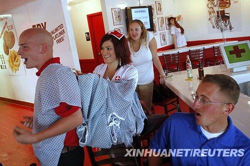 6月17日,在美國亞利桑那州錢德勒的“心臟病燒烤”餐廳,女服務(wù)員在食客就餐前為其穿上病人服。新華社/路透