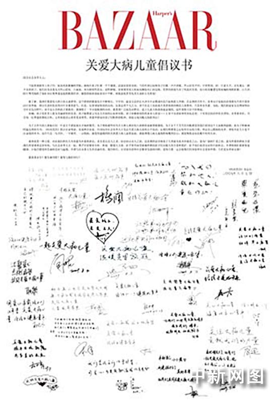 中新網8月10日電 今日,時尚雜志《時尚芭莎》攜手百位明星、名流和企業家發起聯名倡議,呼吁政府相關部門、各級慈善公益組織,共同關注中國大病兒童這一弱勢群體的生存、救助問題。同時,《時尚芭莎》宣布將于9月底在京舉行,本屆活動募集的所有善款都將全部捐助給國內大病兒童救助公益事業,以此慈善盛舉向偉大祖國六十華誕獻禮。