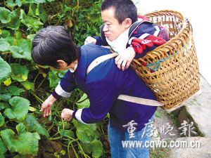 昨日上午,天空飄著細雨。巴南區南彭鎮鴛鴦村一條泥濘的鄉間小路上,一位身穿藍色外套、腳穿解放鞋,身體瘦弱的老婦人,背著一個小背篼,背篼里裝著一個面相30多歲、身高只有幾十厘米的男子,緩慢地走在路上。