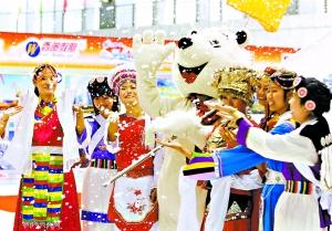 西部美女與吉祥物嬉戲,“2009魅力中華暢冬游”正式開幕。記者張偉清攝