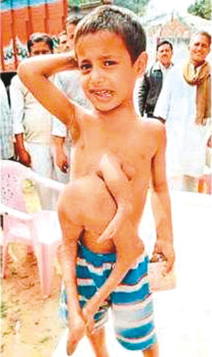據德國《圖片報》2月19日報道,現年8歲的迪帕克·庫馬爾是一名來自印度比哈爾邦的小男孩。從一出生,他的外貌就把周圍的人驚得目瞪口呆:他長著4條腿和3支手臂,在他腹中有個孿生弟弟和他一起來到這個世界上。