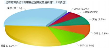 據相關報道,2009年中國托福考生人數較前年大幅增加30%,成為迄今參加托福考試的中國考生人數最多的一年。而隨著世界名校認可度的提升,雅思的市場份額也日益加大。啟德教育官方網在4月至6月間展開了“2010年中國首次中學生留學意向調查”,在本次調查中,選擇雅思和托福考試培訓班的基本持平,分別占32.1%和31.2%。數據統計結果如右圖: