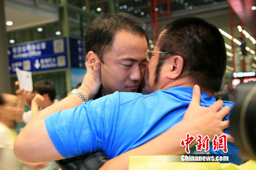 10日晚間,自湖南益陽抵京的翟田田的父親翟泰山及在京親友近十人,到北京首都國際機場接機。當?shù)蕴锾飻y帶簡易手提袋走出機場抵達大廳時,已8年未曾謀面的父子二人相擁而泣。(完)