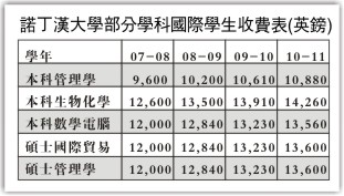 諾丁漢大學位于英國中部。由于近幾年與中國多所院校合作辦學,中國留學生成批涌進這所大學;同時該校還在浙江寧波設立分校,有條件的大三學生會到英國讀書一年。記者聯系到該校的碩士研究生陳兵同學,他詳細列出該校歷年來的收費標準。今年的學費比去年略有上漲,但增長率與往年持平。他覺得這個上調的價格是合理的,中國來的同學都能接受。