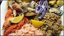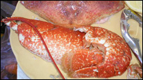 我們接受了店長的建議,從鎮(zhèn)上的小店買來面包和飲料回來,待我們歸來,位子也正好等到了,拼桌!看著菜單上豐富誘人的海鮮,我早已等不及了, 點了這里的招牌菜:兩人份海鮮拼盤(9.5磅每人),其中包括, 美味大蟹,深黃粉紅對蝦, 多汁鳥蛤(海扇),腌熏三文魚,對蝦,鯡魚,煙熏馬加魚,蚌和綠蚌貝,另外我們還點了大龍蝦,奶油蒸歐洲蠔(只有9月和4月之間可以吃到)和蔬菜沙拉。品嘗海鮮最好配以檸檬,芥末,醋,壽司醬油,和辣椒醬。 店內(nèi)提供檸檬,塔巴斯哥辣醬油和醋,如果你還想要什么配料,可以在小鎮(zhèn)的店上找到。