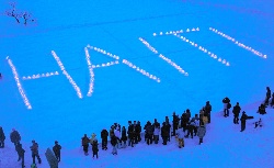 這次祝福祈愿燭火會是由國際大學的留學生會組織的。大家在校園內的一塊空曠的雪地上用點燃的蠟燭拼寫出一個大大的“HAITI”,并一起為在海地大地震中遭遇不幸的人們祈禱祝福,追悼亡靈。