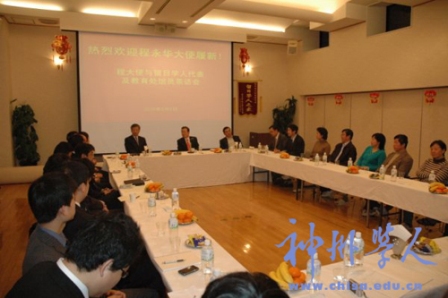 3月5日下午,新任駐日大使程永華在孔鉉佑公使的陪同下來到大使館教育處,專程看望來自東京地區東京大學等10所大學的留學生代表和留日支援西部博士專家團、全日本中國人博士協會、在日華人汽車工程師協會、在日中國科技者同盟的負責人,并出席了與留學人員交流茶話會。教育處公使銜參贊孫建明主持了茶話會。