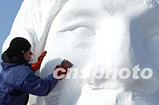 第十五屆冰雪博覽會雪雕比賽正在哈爾濱市太陽島上舉行,來自中國、美國、加拿大、俄羅斯、日本、韓國、馬來西亞等國家的選手精心雕制各自的作品。圖為加拿大選手正在制作《印第安酋長》。作者:毛建軍
