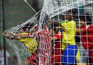 兩人發生爭斗,兩方隊員打成一團,羅納爾迪尼奧累計2張黃牌被罰下。