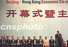 第七屆北京·香港經濟合作研討洽談會二十三日在北京飯店舉行開幕儀式,香港特別行政區政府財政司司長唐英年(左二)致辭表示:北京與香港通過CEPA的合作將使雙方呈現“雙龍出海”之勢。中新社記者:廖文靜