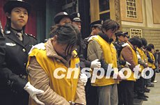 北京警方十二月九日對(duì)在冬季百日會(huì)戰(zhàn)以來(lái)查處的聚眾賭博、吸毒販毒、制假販假等五十余名違法犯罪人員進(jìn)行公開(kāi)處理。中新社記者:任海霞
