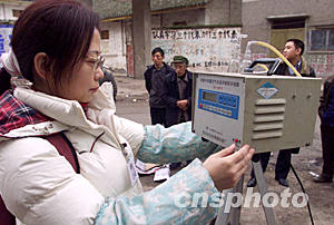 川東北氣礦“一二·二三”井噴特大事故封壓工作獲得成功后,工作人員立即進入受災核心區,清理現場的動物尸體,進行登記和銷毀工作。另外,由于核心區內的空氣及水源水質也受到不同程度的污染,環保部門也在進行水質和大氣監測。圖為環保工作人員正在對井噴事故發生地的空氣進行檢測。作者:周舸