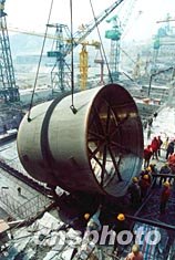 三峽工程右岸排沙孔4號排沙管一個重達15.4噸的首節排沙管,3月10日成功吊裝就位,這標志三期右岸排沙管安裝工程拉開序幕。4號排沙管由不銹鋼復合鋼板制成,有37個安裝節,管口內徑5米,總長127.57米。三峽的右岸排沙管共8條,其主要作用是在長江汛期和洪水期排泄庫區泥沙。作者:孫榮剛
