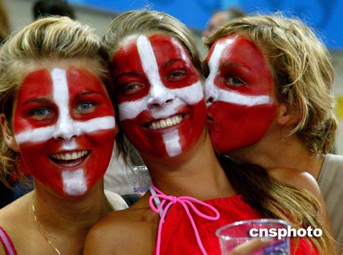 在當(dāng)?shù)貢r(shí)間8月26日晚舉行的奧運(yùn)會(huì)女子手球四分之一決賽上,丹麥女球迷將國(guó)旗畫(huà)在臉上為本國(guó)選手助威。中新社記者:王瑤