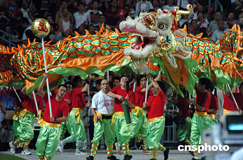 為歡迎國家奧運金牌代表團訪港,九月七日香港舉行“金牌精英大匯演”,圖為“大匯演”上巨龍飛舞。中新社記者:錢興強