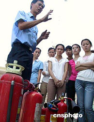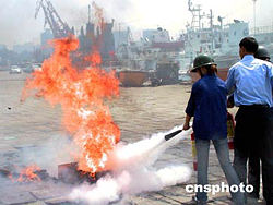 中國第一列跨海火車客運列車即將開通,應聘的列車乘務員們九月中旬接受海南海事局海船船員專業知識培訓,這是消防教員在講解滅火器的操作。據了解,這些乘務員將成為國內第一批擁有海船船員資格證書,同時服務于陸地與跨海運輸的火車乘務員。作者:關向東