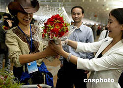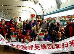 西藏自治區(qū)體育局、中國科學探險協(xié)會主辦的“珠穆朗瑪峰環(huán)保大行動”圓滿結束,十六日二十余名志愿者、新聞記者順利返回北京時,興高采烈地在首都機場合營留念,祝賀活動圓滿結束。中新社記者:宋吉河