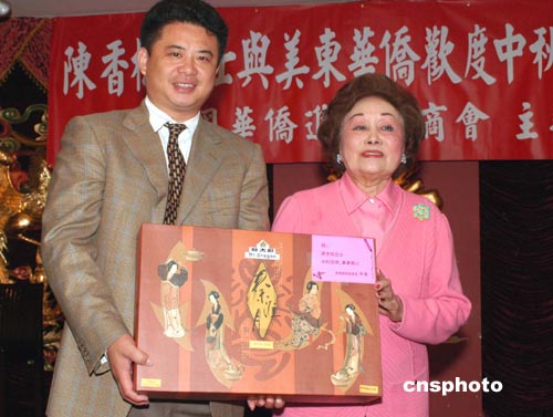 美東時間二十四日中午,著名美籍華人陳香梅從華盛頓趕到紐約,與美東華僑一起歡度中秋佳節。美國華商會會長鄧龍在聯誼會上向陳香梅(右)贈送精制的月餅。 龔文謨 攝