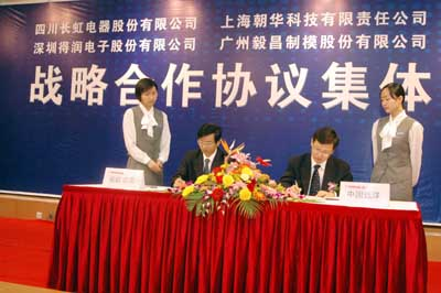 中新四川網9月28日消息(肖青)今天是花好月圓的中秋佳節,四川長虹集團佳音頻傳:董事長趙勇分別與上海朝華科技、中遠物流、廣州金發等5家企業老總握手簽下五份戰略合作協議,簽約數量之多、涉及領域之廣,創下中國家電業紀錄。而長虹此次將多元化的業務模塊廣泛與國內專業公司整合,更凸現了長虹欲打造與數字電子優勢產業并重的“聯合艦隊”的決心。