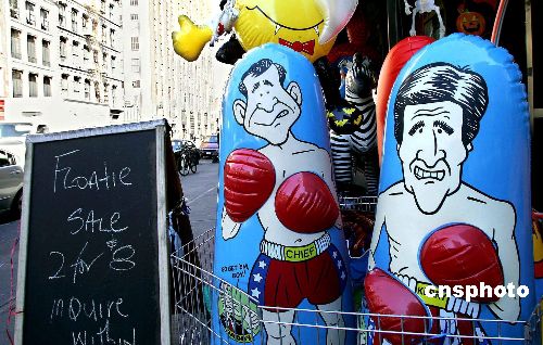 10月12日,印有布什、克里形象的拳擊氣囊在美國紐約街頭出售,顧客可以買來發(fā)泄“私憤”。Ic/cnsphoto 攝