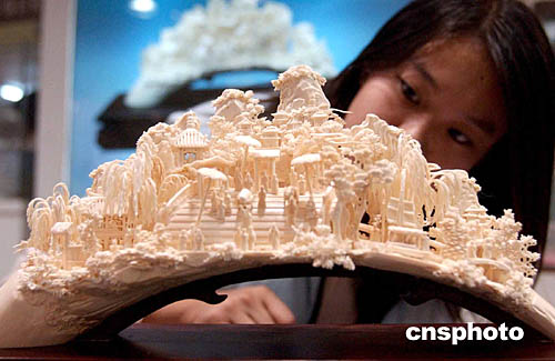 | 十二月十日,一座長47厘米、高24厘米的精美《清明上河圖》象牙雕刻工藝橋,亮相王府井工美大廈四層玉石文化商場。該作品選取明代張擇端《清明上河圖》畫卷中的一個場景,具有很高的藝術(shù)欣賞價值和收藏價值。象牙素有“白色的金子”之美譽(yù),因其資源的稀缺性、制品的珍貴性,為收藏價值預(yù)留了無限空間。作者:韓藝冰