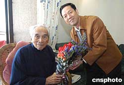 一生奉獻(xiàn)教育事業(yè),親身見證澳門回歸的九十八歲老歸僑梁披云,接受中新社記者采訪時為澳門升平景象感欣慰,當(dāng)他接過中新社香港分社總編輯周景洛的鮮花時面露喜悅。作者:梁永強