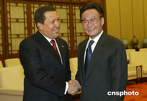 吳邦國說,兩國領導人交往對發展雙邊關系有重要意義?偨y閣下第三次來訪正值中委建交三十周年的重要時刻,必將推動中委共同發展的戰略伙伴關系進一步發展。吳邦國感謝委內瑞拉堅持一個中國政策。