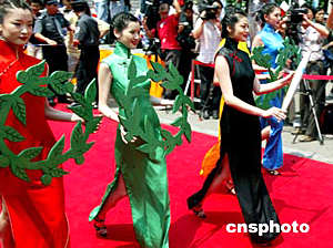 六月八日,2004年雅典奧運火炬展示活動在北京慕田峪長城舉行,身著奧運五環顏色旗袍的模特手持火炬、橄欖枝步入會場。中新社記者:鄭萍萍