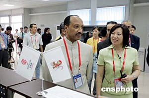 二零零四年亞洲杯足球賽七月十七日晚在北京工人體育場開幕,開幕式前,亞足聯(lián)主席哈曼在工作人員陪同下考察新聞中心等設(shè)施。中新社記者:毛建軍