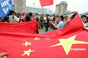 七月十七日,中國球迷在亞洲杯足球賽開幕式會場外吶喊,為亞洲杯首度在中國舉辦而喝彩。二零零四年亞洲杯足球賽當(dāng)晚在北京開幕。中新社記者:毛建軍