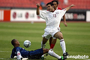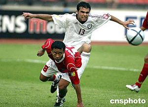 2004年亞洲杯足球賽A組第二場比賽卡特爾隊對印度尼西亞隊的比賽,7月18日在北京工人體育場賽進行。卡塔爾隊得勢不得分,最終被“黑馬”印度尼西亞隊以二比一戰(zhàn)勝。作者:盛佳鵬