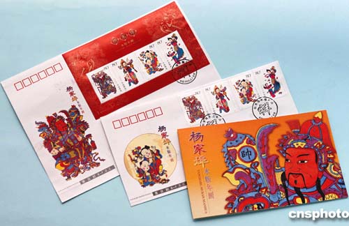 | 北京市郵票公司為配合國家郵政局于2005年2月1日發(fā)行《楊家埠木版年畫》特種郵票(1套4枚),特設(shè)計印制了該郵票的首日封(中)、小全張首日封(左)、郵折(右)等郵品,并將與郵票同日發(fā)行。《楊家埠木版年畫》特種郵票名稱分別為“門神”、“連年有余”、“喜報三元”、“天女散花”,面值均為80分,小全張售價4.80元!皸罴也耗景婺戤嫛痹诿鞔鷷r起源于山東濰坊市濰縣楊家埠,盛于清代,流傳至今,堪稱為民間美術(shù)珍品。作者:鄒憲