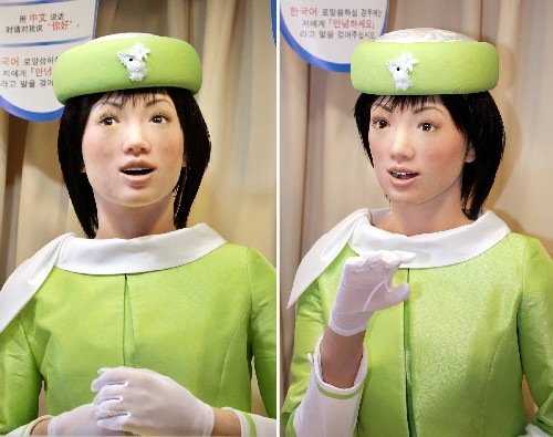 咨詢臺機(jī)器人職員是由日本可可洛公司和先進(jìn)傳媒公司研制的,外表似二十多歲的日本女子,能聽懂四萬多個中文、英文、日文和韓文語句。
