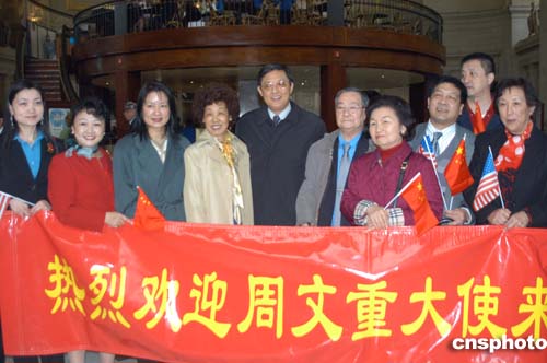 中國新任駐美大使周文重當(dāng)?shù)貢r間四月三日中午抵達(dá)美國首都華盛頓履新,受到當(dāng)?shù)厝A人僑學(xué)界代表的熱烈歡迎。