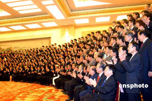 五月二十日,中國國務(wù)院總理溫家寶、國務(wù)委員唐家璇、全國政協(xié)副主席劉延?xùn)|、全國政協(xié)副主席羅豪才、國務(wù)院僑辦主任陳玉杰等在北京人民大會堂會見“第三屆世界華僑華人社團(tuán)聯(lián)誼大會”的全體與會代表并合影留念。作者:張勤