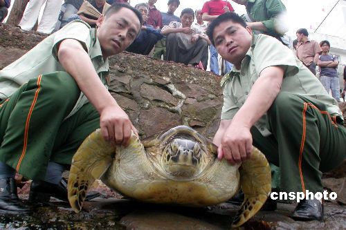 6月14日下午,浙江臺州大陳邊防派出所兩位警官,在轄區了解情況時,得知當地漁民捕到一條70公斤重海龜,海龜年齡在百歲以上,民警們動員漁民把海龜放生回大海。作者:梁駿