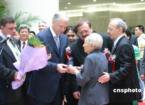 | 六月十八日,俄羅斯國家杜馬主席格雷茲洛夫出席了重慶市直轄八周年紀(jì)念活動(dòng)和《紀(jì)念二戰(zhàn)勝利六十周年圖片展》開幕式,并參觀了蘇軍烈士紀(jì)念墓和原蘇聯(lián)大使館重慶舊址。圖為格雷茲洛夫(左二)向東北抗日聯(lián)軍老戰(zhàn)士胡真一女士(右二)頒發(fā)“偉大的衛(wèi)國戰(zhàn)爭勝利六十周年紀(jì)念章”。作者:郭晉嘉