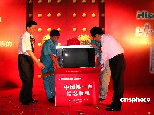 今天在此間海信集團研發(fā)中心舉行的儀式上,青島市市長夏耕和海信集團董事長周厚健為第一臺下線的裝有“信芯”的海信高清彩電封箱。隨后,青島市副市長吳經(jīng)建代表市政府宣布,獎勵海信研發(fā)團隊二百萬元人民幣。海信集團也表示把首批一百臺“信芯”彩電捐贈給分布在西部地區(qū)的三十所海信希望小學(xué)。