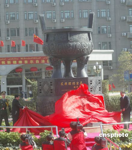 中共中央政治局常委、中央政法委書(shū)記羅干(左)與新疆維吾爾自治區(qū)黨委書(shū)記王樂(lè)泉(右)在烏魯木齊為“民族團(tuán)結(jié)之鼎”揭幕。