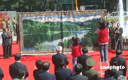 中共新疆維吾爾自治區(qū)委書(shū)記王樂(lè)泉(左)烏魯木齊市在向中央代表團(tuán)贈(zèng)送掛毯。