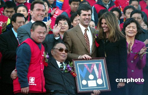 | 十一月十四日,中國殘疾人聯合會主席鄧樸方(中)被國際特奧會授予“特殊奧林匹克運動杰出領導人獎”。國際特奧會主席蒂姆·施萊佛、美國加州州長阿諾·施瓦辛格(左一)、中國殘疾人聯合會主席鄧樸方共同出席了在北京中華世紀舉行的“快來參加特奧”大型火炬接力跑活動。之后,施瓦辛格將在梅地亞中心出席見面會、慈善拍賣活動及慈善晚宴,所募集的捐款都將捐予中國特奧會用于中國特奧運動的進一步發展。作者:韓藝冰