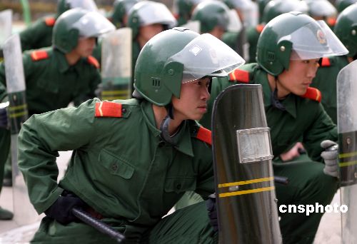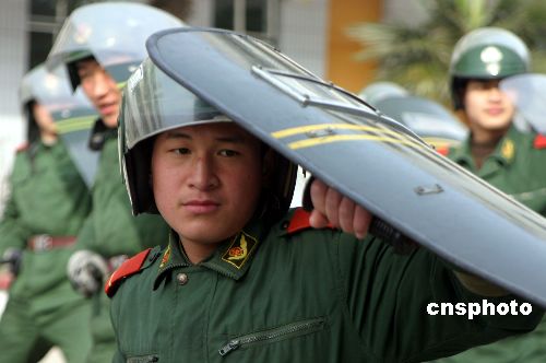 | 2月8日,武警南京市支隊?wèi)?zhàn)士在進(jìn)行盾牌警棍驅(qū)散隊形演練。為了應(yīng)對燈會可能出現(xiàn)的突發(fā)情況,武警江蘇總隊在以往燈會安全保衛(wèi)工作的基礎(chǔ)上,根據(jù)人流正常時、人流增多時、人流擁擠時、人流飽和時等四種情況設(shè)想,出動1500余名官兵進(jìn)行警容儀態(tài)、緊急出動、盾牌警棍隊形等多個軍事科目預(yù)案演練,防止踐踏事故等惡性的發(fā)生,全力以赴確保元宵節(jié)游客度過祥和、歡樂的元宵。據(jù)了解,一年一度的南京夫子廟燈會以秦淮傳統(tǒng)手扎燈為主打的各色花燈屆時將迎來中外游客逾60萬人。作者:唐占軍