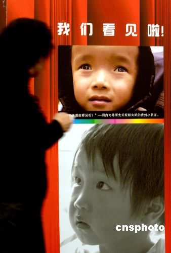 | 3月2日,一名參會人員觀看“健康快車”為貧困白內(nèi)障患者重見光明的圖片展板。自1997至2005年底,香港同胞捐贈內(nèi)地、免費為貧困白內(nèi)障患者實施復(fù)明手術(shù)的三列列車醫(yī)院已在中國的20個省、自治區(qū)、直轄市56個地區(qū),使54225名白內(nèi)障患者重見光明。 作者:韓藝冰